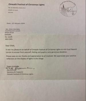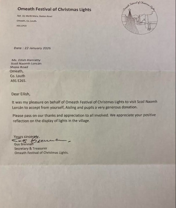Thank you to the pupils and parents of Scoil Naomh Lorcán, who kindly contributed to a collection for the volunteers of the Omeath Christmas Lights Committee as a thank you for all their hard work. We greatly appreciate the many hours these volunteers dedicate to making our village shine throughout Christmas for everyone to enjoy.